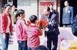 網主接受得獎學生代表贈旗 |  網主接受聾啞學校校長獻花 |  網主DODO與得獎學生擁抱 |